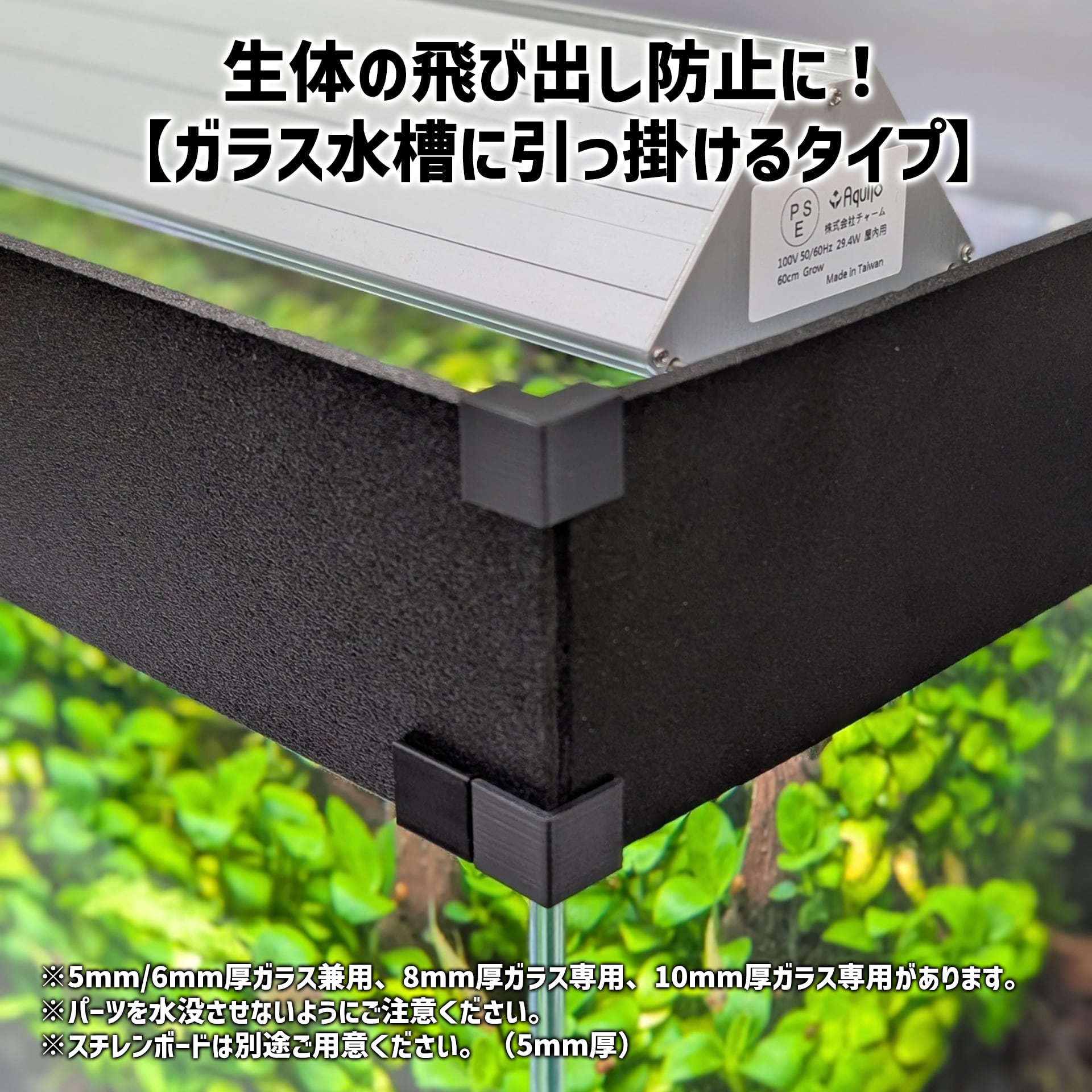 アクアリウムで最も発生する事故、生体の飛び出しを防ぐアイテムです。小型熱帯魚や小型エビの水槽外への飛び出しを軽減できます。