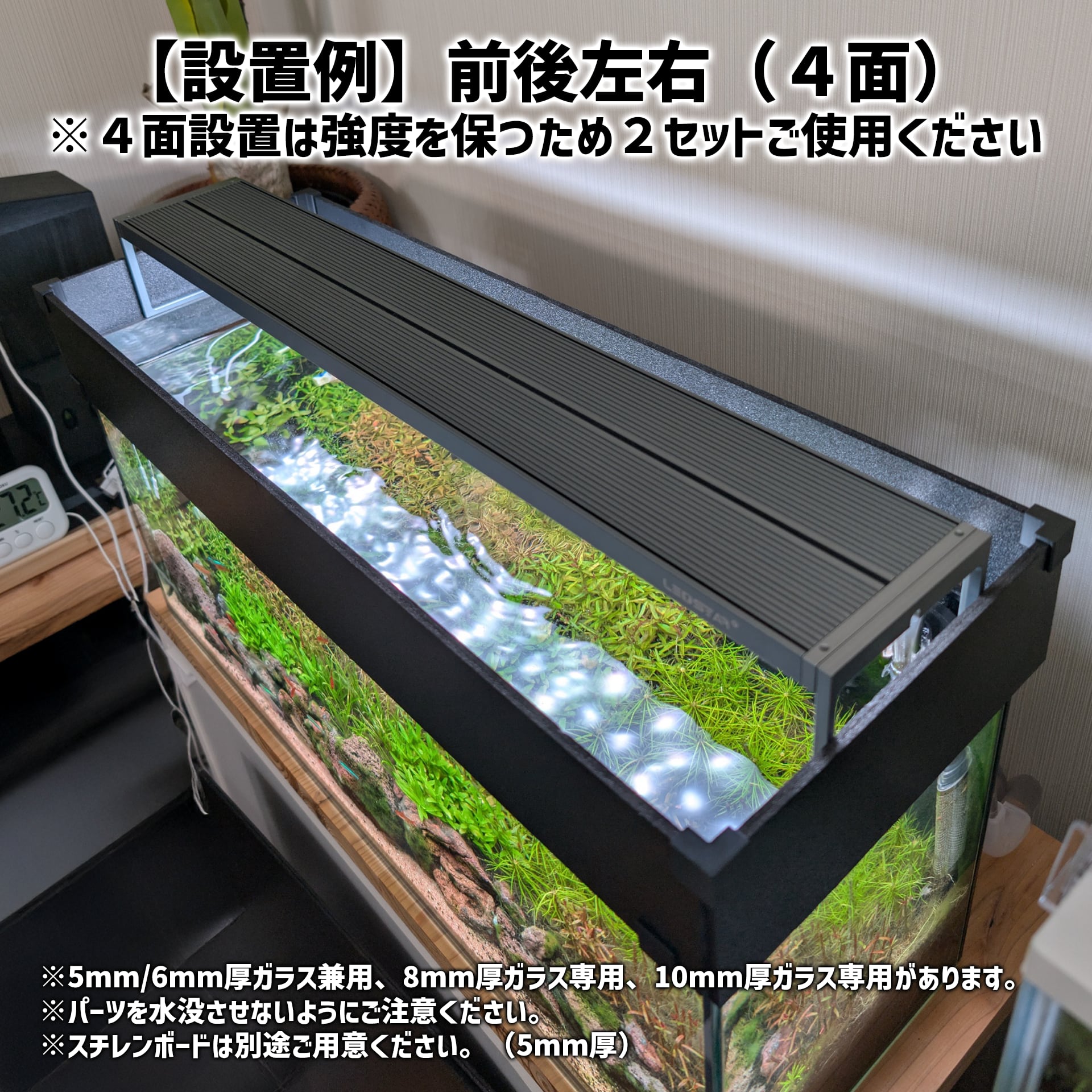 オールガラス水槽に使用いただけます。アクリル水槽は傷が付く可能性があるので使用しないでください。設置方法は紹介動画をご確認ください。