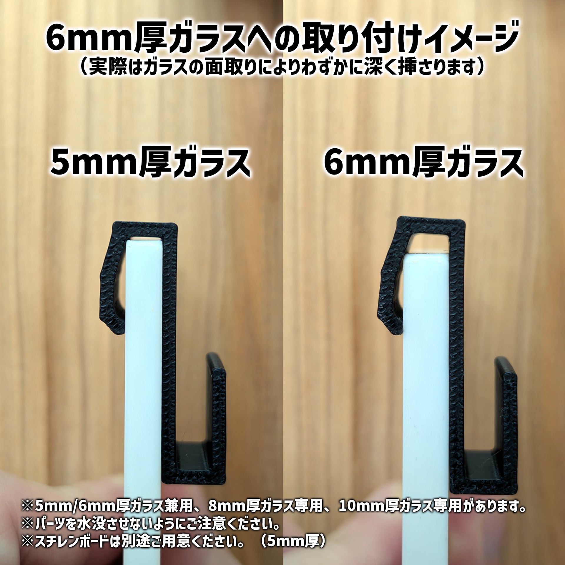 5mm/6mm厚ガラス兼用、8mm厚ガラス専用、10mm厚ガラス専用の3種類があります。サイズオプションからお選びください。8mm用、10mm用は記載の金額がプラスされます。