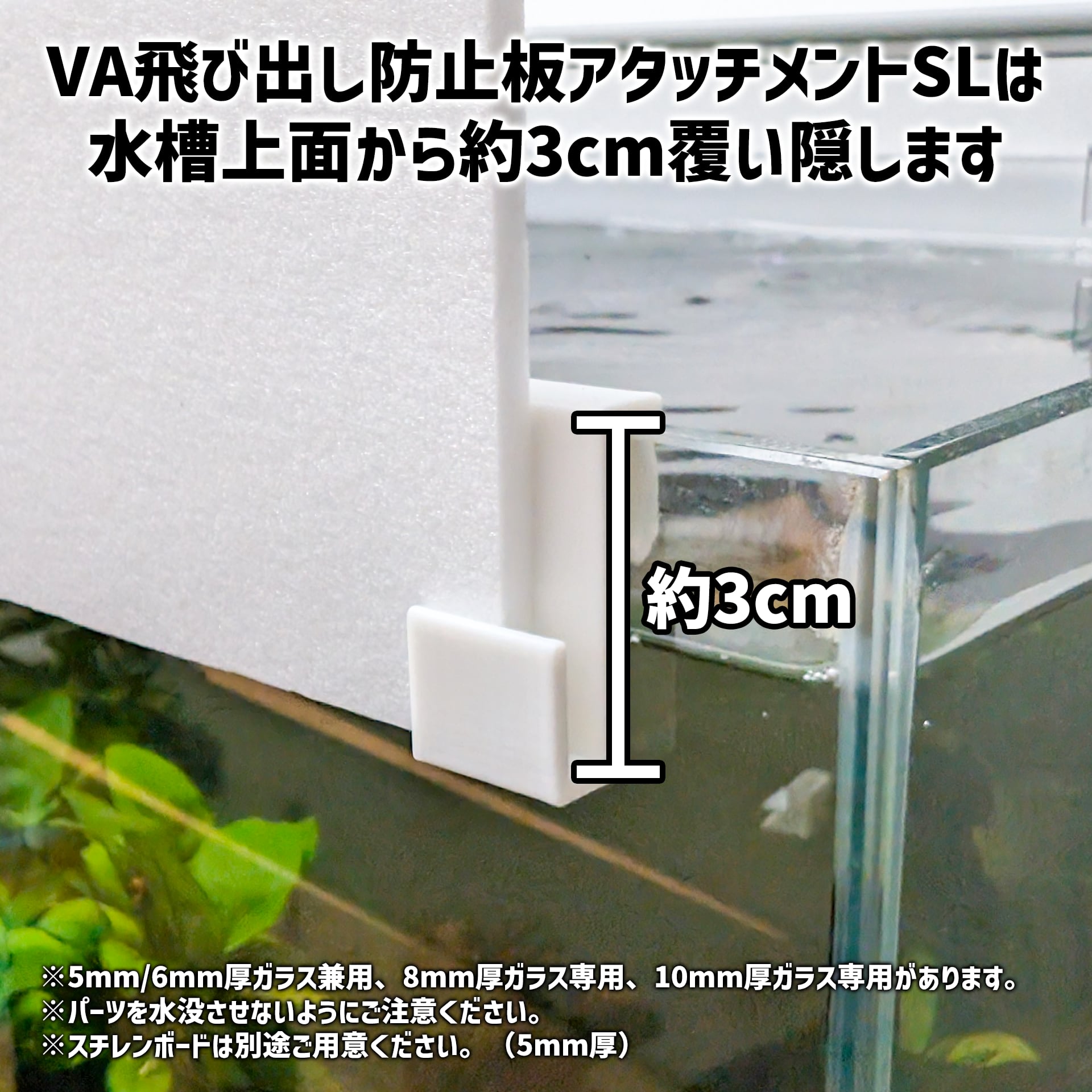 VA飛び出し防止板アタッチメントSLは水槽上面から約3cm分を覆い隠します。覆い隠したくない方はVA飛び出し防止板アタッチメントHFをご検討ください。